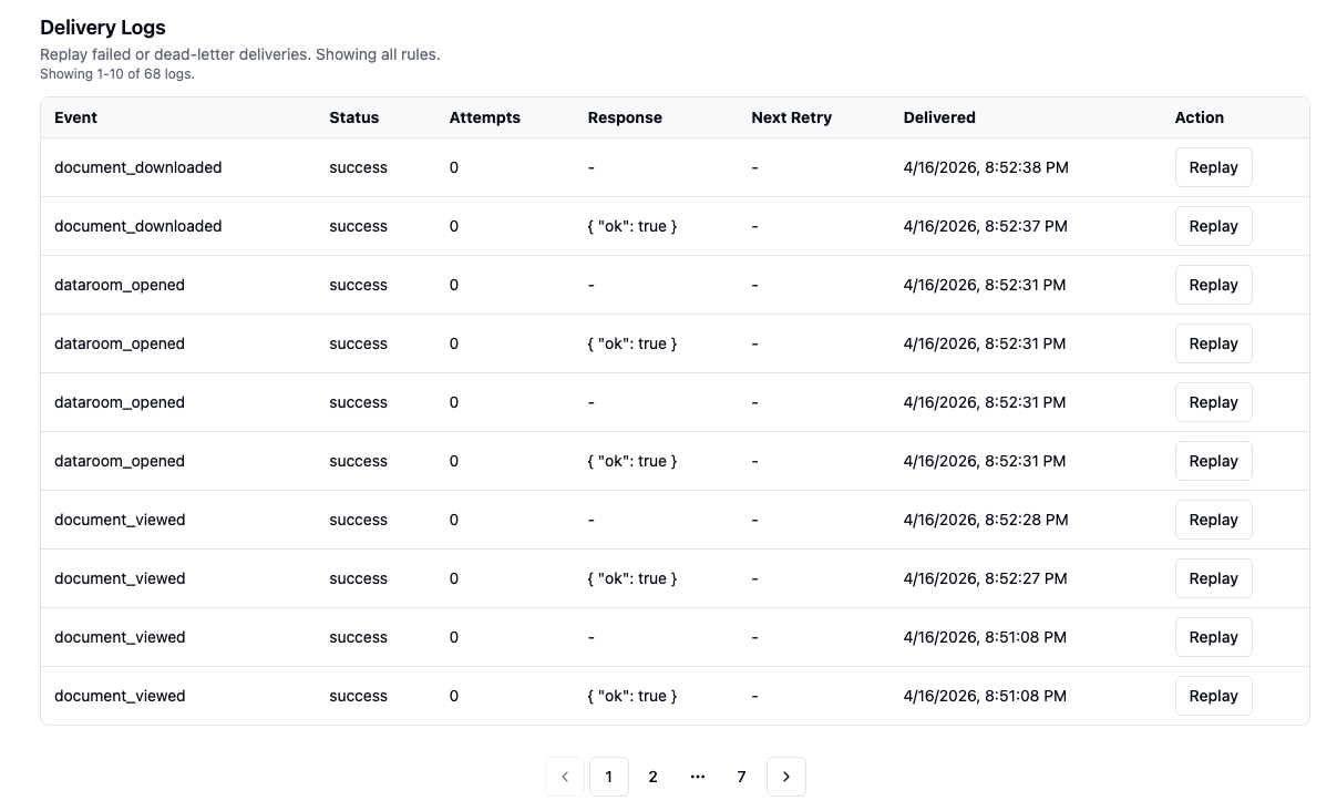 Every outbound event delivery is tracked with operational logs, retry support, and replay controls.