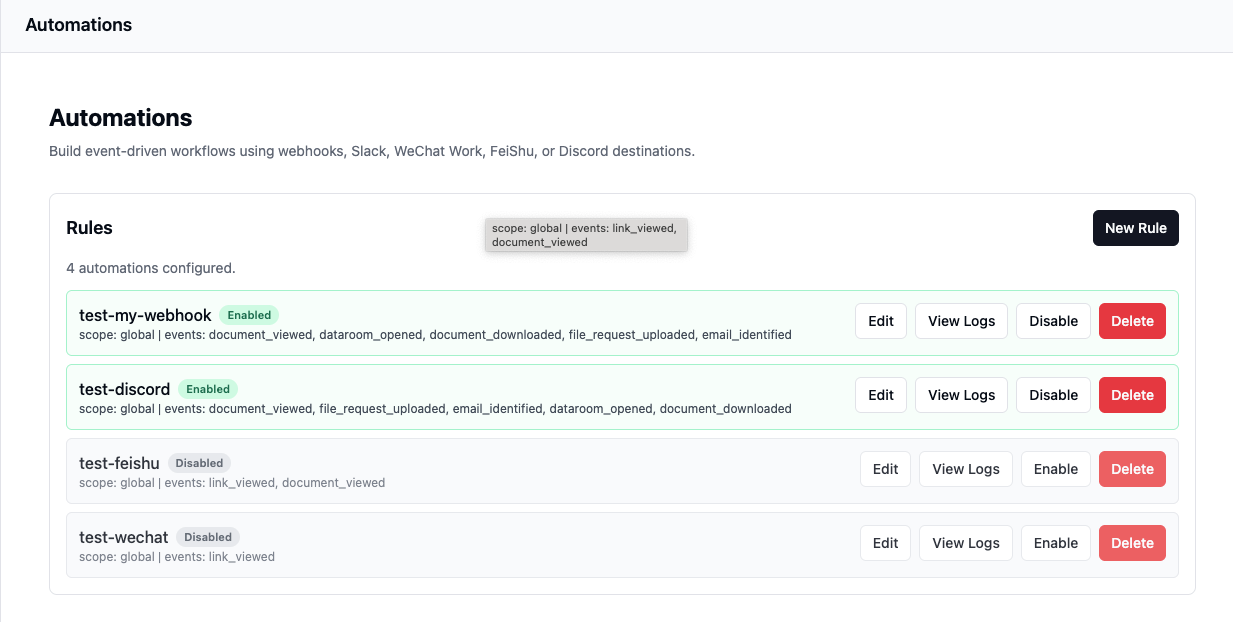Teams can use document engagement automation, dataroom automation, Slack document notifications, and webhook-based document tracking while keeping files and event data inside their own infrastructure.